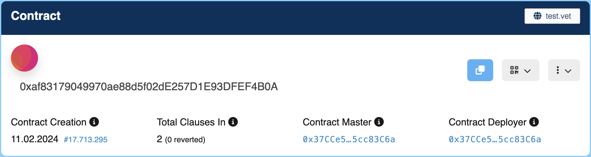 Here's a screenshot showing a contract linked to test.vet. The the contract's address was also configured in test.vet to prove ownerships: